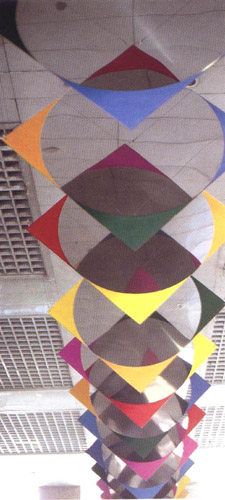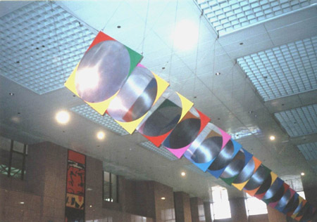 構想來自萬華火車站附近的慶祝燈飾,橫跨街頭的黃色燈籠;售票大廳上方懸掛20片120平方公分的鏡面鋁片,方中帶圓的圖形配合四角局部裝飾性的色塊,映照艋舺街道裝置慶點的燈飾,帶給車站一種幾何秩序與韻律躍動的視覺新意。