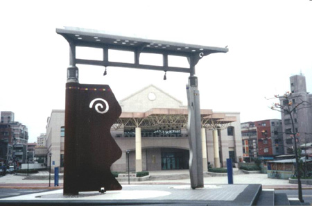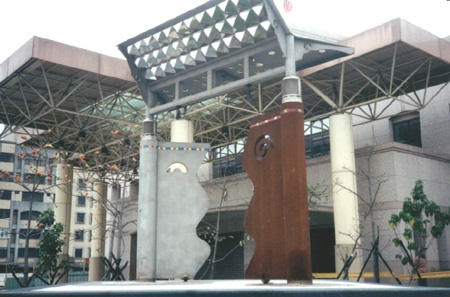 男」、「綠女」的顏面,隱喻紅男綠女之聚散離合。作品採方正基地,延伸兩階段性的迴旋階梯,在步行的過程中自能感受到具儀式性、穿越旋轉的抽象空間體驗。