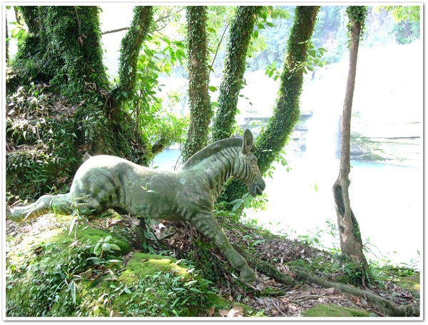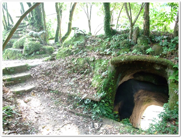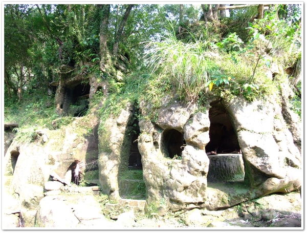 瀑布潭水邊有人工開鑿出的洞窟景觀