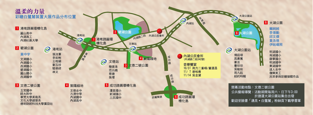內湖地區許多學校均擁有優秀之表演人才,開幕當天將有在地學校及社團精彩演出,同時並將由策展人親自導覽系列作品。